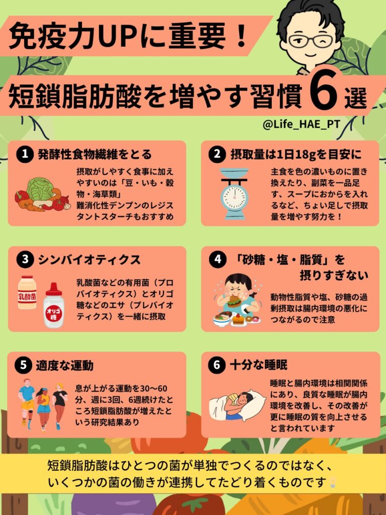 | 運動との関連 | 産生増加の可能性 | 有酸素運動で便中SCFA増加 |